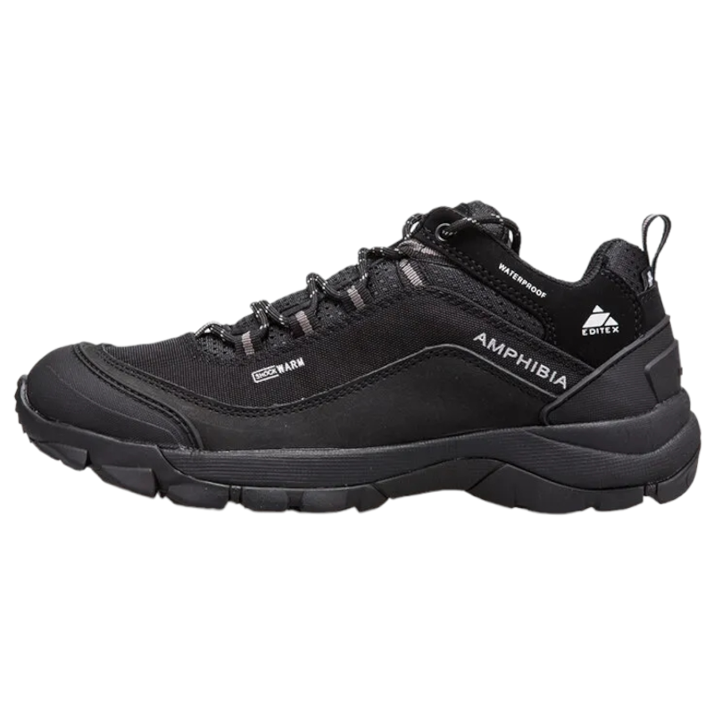 Ботинки для активного отдыха Editex Amphibia за счёт современных материалов, удобной посадке и форме позволят в полной мере насладиться пешими походами по сложной местности, не боясь за состояние ботинок. Износостойкий внешний слой изделия выполнен на основе нейлона по технологии Beproteck, что в сочетании с прошивкой из двойной строчки со вставками из нубука позволяет выдерживать различные погодные условия. Благодаря дополнительным резиновым усилителям носок и пяток ботинки выдерживают ударные нагрузки при ходьбе по каменистой поверхности, защищая ноги владельца. Специальная съёмная стелька Ortholite обладает антимикробной обработкой, защищая от микробов и неприятного запаха, а дополнительная вентиляция стопы ног и некоторой амортизации делает ношение ботинок комфортным занятием. Эффективное распределение нагрузки при ходьбе обеспечивает промежуточная подошва, произведённая по технологии EVA, улучшая износостойкие характеристики изделия. Подошва Ultra Slip Protection (USP) благодаря сочетанию прочной и гибкой резины с развитым рисунком протектора, обеспечивающий надёжное сцепление с поверхностью, позволяет уверено чувствовать себя при походах по пересечённой местности. Качественная шнуровка с прочными петлями позволяет изделию крепко сидеть на ноге, а дополнительная петля на задней части позволит с удобством надевать и снимать ботинки. Качественная сборка на основе прочных материалов позволяет ботинкам не только выдерживать различные погодные условия, но также и сохранять свои функциональные свойства, форму и цвет после множественной стирки. Чёрный утилитарный дизайн позволяет носить обувь не только в походах, но и в городе, отлично сочетаясь с повседневной одеждой.Характеристики: